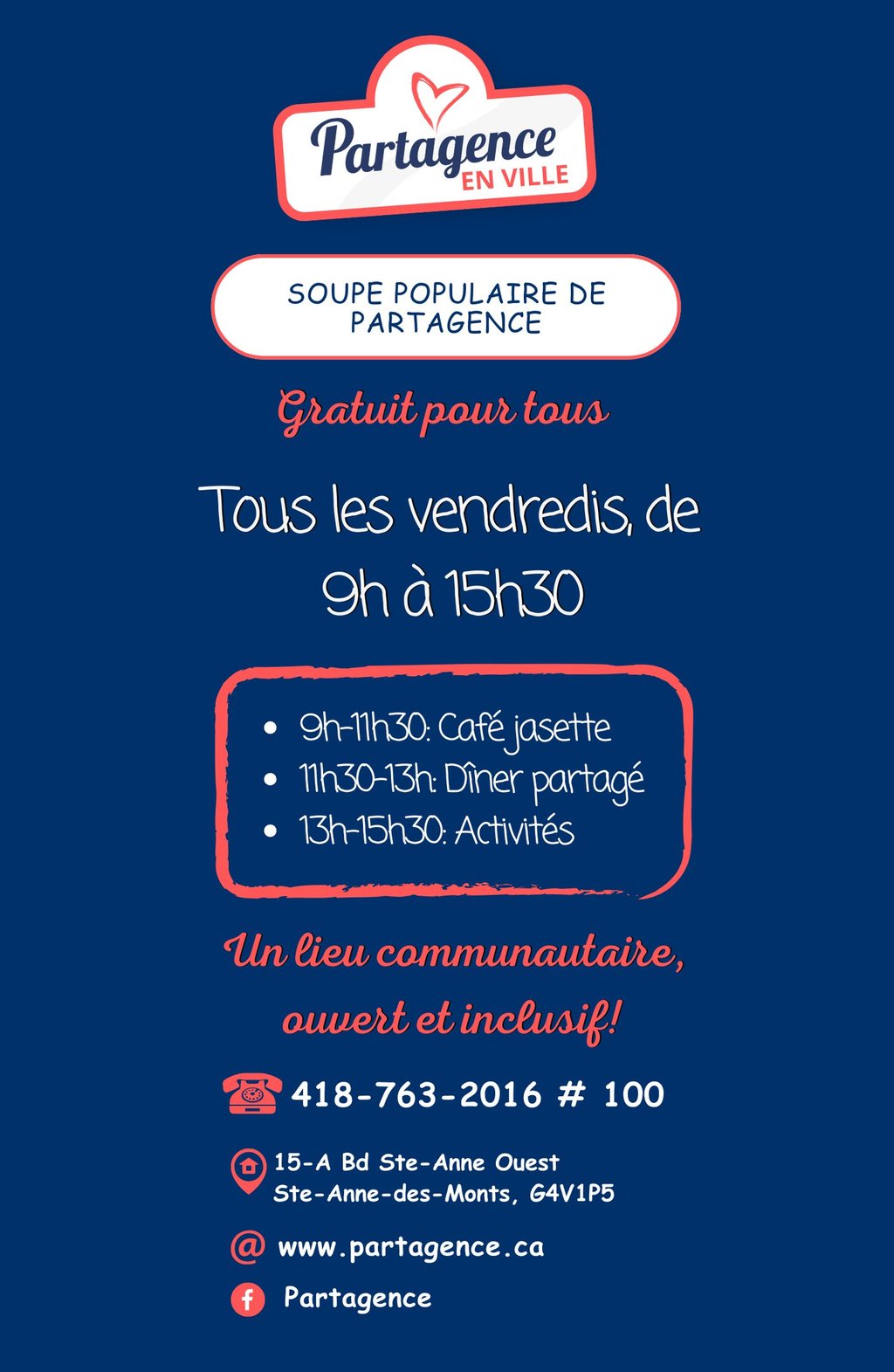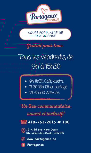 Soupe, café et biscuits gratuits, tous les vendredis! Des activités spéciales sont programmées 2 à 3 fois par mois. Si tu veux plus d'info, consulte notre page Facebook !